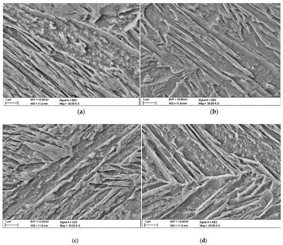 SEM observations confirmed the presence of the lath-type martensitic-bainitic microstructure (Figure 6). Bright, thin layers observed in the microstructure are probably the remains of retained austenite [8,38]. This metastable phase is partially transformed into strain-induced martensite. However, this requires more detailed microscopic investigations. The laths have various thicknesses. Inside the bainitic areas, small precipitates characterized by a different shape can also be identified. This indicates the initiation of carbide precipitation during the isothermal holding step following the hot rolling.