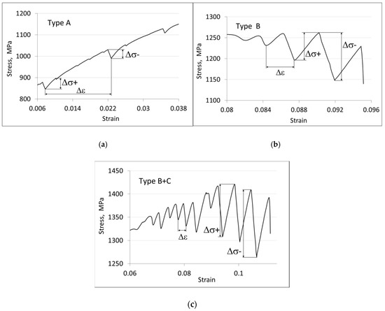 Results obtained in the present study showed that the temperature factor has a significant influence on the PLC occurrence. The steel deformed at 20 °C showed no evidence of plastic instability (Figure 2a). Characteristic serrations were detected at elevated deformation temperatures: 60 °C, 100 °C, and 140 °C (Figure 2b–d). It is interesting that the type of oscillations and their amplitude substantially depend on the deformation temperature. The specimen deformed at 60 °C showed oscillation classified as an A type. The serration occurred in a uniform elongation range, i.e., earlier than in steels deformed at higher temperatures—already at a strain level of 0.006. Moreover, this appeared regularly and its amplitude was quite low (Figure 7a). A similar type of serration was observed in medium-Mn steels by other authors [14,15]. However, the type of serration and plastic instability deformation range shifted to a higher deformation level when increasing the deformation temperature. The instable flow behavior was initiated in a post-uniform elongation range. Moreover, the amplitude of serration rose as the deformation temperature increased (Figure 7b,c). Sun et al. [15] reported that this can be due to the higher fraction of untransformed austenite at higher deformation temperatures. This phase is especially sensitive to the plastic instability phenomenon, like in pure high-Mn steels [18,19,20]. The type of serration observed at 100 °C was classified as a type B. In the case of 140 °C, the B and C types occurred with the highest amplitude and strain extent (Table 3).
