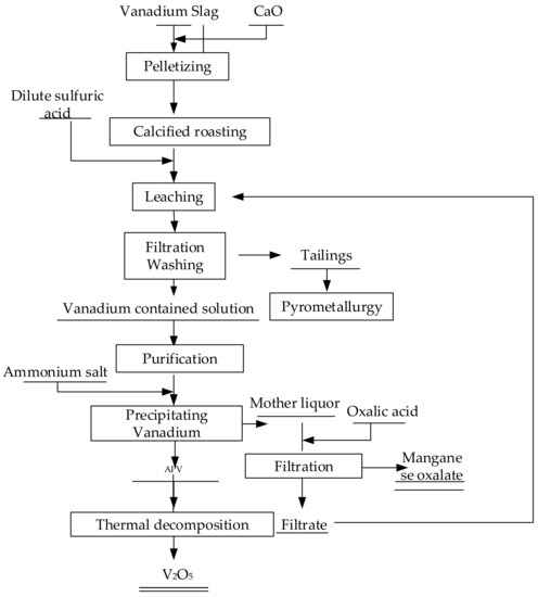 The conventional process of sodium salt roasting followed by water leaching for vanadium extraction from the vanadium slag is mature and operationally steady. However, it seriously pollutes the environment, and has difficulties in comprehensive utilization of the leaching residue and in the recycling of wastewater, which contains high concentration of sodium. Consequently, some novel processes for cleaner vanadium extraction have been proposed, like roasting without adding salt [4], submolten salt extraction [5,6,7], alkali decomposition enhanced by electrochemistry [8], direct acid leaching [9,10,11], sulfating roasting [12] and calcified roasting followed by dilute acid leaching [13,14]. Vanadium extraction with calcium salt roasting is increasingly concerned these years due to its lower cost of roasting additive, no emission of pollutional gas, like HCl, Cl2, SO2 and SO3, and no sodium contained in subsequent leaching residual and wastewater. Besides, the roasted vanadium slag with calcium is usually leached by dilute sulfuric acid with relatively higher selectivity for vanadium, and then a weakly acidic vanadium solution is obtained, which is beneficial to subsequent purification procedure [15]. The calcified roasting–dilute acid leaching process was first proposed and carried out by the Tula Vanadium Factory in 1974 [16]. Hereafter, Pangang Research Institute also made a lot of research on this process [17,18,19,20,21]. However, because the problem of purifying the acidic vanadium solution was still unsolved, the purity of vanadium pentoxide was only 93–94% and was inferior to the vanadium pentoxide prepared by the sodium roasting process. In this paper, a cleaner process including calcified roasting, dilute acid leaching, precipitation purification, vanadium precipitation with ammonium salt followed by thermal decomposition was proposed to extract vanadium resource from the converter vanadium slag, and this process was evaluated in respective of vanadium recovery, quality of the vanadium pentoxide product and its influence imposed on environment.