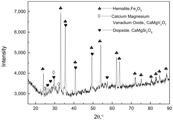 - Wang, M.H.; Liu, Z.H.; Zhao, H.; Liu, Y.; Lou, T.P.; Sun, Z.H.; Tang, H.J.; Jing, H. Measurement of calcification of vanadium slag by XRD semi-quantitative method. Iron Steel Vanadium Titan. 2018, 39, 6–12. (In Chinese) [Google Scholar] [CrossRef]