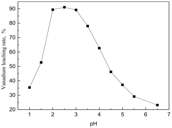 Effect of pH on the vanadium leaching rate (particle size of 75–96 μm, time of 60 min, T = 65 °C, L/S = 4, stirring speed of 500 rpm).