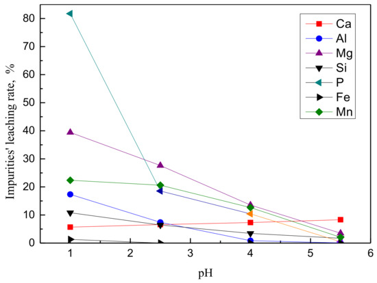 Effect of pH on the leaching rate of impurities (particle size of 75–96 μm, time of 60 min, T = 65 °C, L/S = 4, stirring speed of 500 rpm).