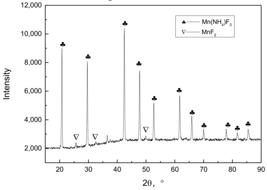After roasting and leaching under optimized conditions, the obtained vanadium-bearing solution contained vanadium around 20 g/L which meets the requirements for vanadium concentration in the subsequent vanadium precipitation step. However, since the impurities contained in the solution will bring side effects on vanadium precipitation rate and quality of vanadium pentoxide, they have to be removed. In this study, a composite fluoride was used to remove Ca, Mn, Al and Si at constant pH of 4.50 ± 0.05. This composite reagent was prepared through reaction between MnSO4·H2O and NH4F for 20 min at molar ratio of 1/7 and temperature of 70 °C followed by filtration and washing several times to remove the free NH4+ and SO42−. The white precipitate was then dried at 80 °C for 120 min for chemical analysis and characterization with XRD. It was found the mass ratio of F to Mn contained in this white powder was close to 1.0 and its XRD pattern was shown in Figure 7. It can be seen that the produced powder is mainly composed of Mn(NH4)F3, which is called as a composite reagent, and this composite reagent is represented by Mn(NH4)F3 to facilitate the calculation of adding amount.