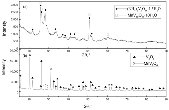 XRD pattern for products of vanadium precipitate (a) ammonium poly-vanadate; (b) vanadium pentoxide.