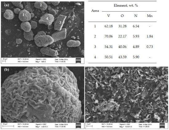 Scanning electron micrographs for ammonium poly-vanadate and vanadium pentoxide powder, (a) ammonium poly-vanadate × 500; (b) ammonium poly-vanadate × 4,000; (c) vanadium pentoxide powder × 10,000.