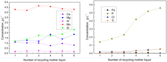 After the manganese was extracted, the mother liquor was reused to leach the roasted slag. In our study, the wastewater was recycled six times, and relationships between the number of recycle and the concentrations of impurities in the leaching solution were shown in Figure 11. Correspondingly, the effects of number of recycling mother liquor on the quality of vanadium pentoxide were shown in Table 4.