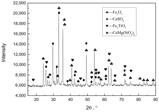 Combining the chemical composition, phase composition with the scanning electron microscope and energy dispersive spectrometer (SEM-EDS) analysis of the raw vanadium slag, we knew that the main vanadium-bearing phase (white area in Figure 1) was vanadium spinel [(Mn, Fe) (V, Cr)2O4] which was wrapped by the matrix phases-fayalite (gray area) and augite (black area); the content of Si in augite was higher than that in fayalite; Fe was distributed as Fe2+ in spinel, fayalite and augite phases.
