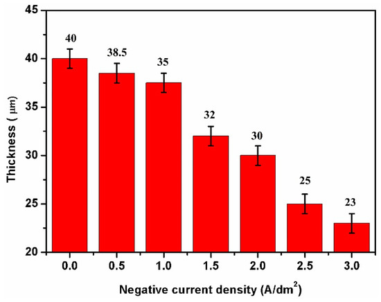 Figure 3 displays the thickness of HPA coatings that were prepared at different negative current densities for 30 min. It could be found that the coating thickness decreased gradually with the increasing negative current densities. It was about 40 µm without negative current, while it reduced to 23 µm at the negative current density of 3.0 A/dm2. The variation trends of coating thickness were consistent with the values of the final voltages in Figure 2. Due to that, the coating growth rate was determined by an intense competition between the formation and dissolution of coatings, which proceeded simultaneously. The two inverse processes could be expressed in formulas (1) and (2), respectively [31]. The higher negative current density caused more H+ to move toward the coating/electrolyte interface under the action of an external electric field, thus accelerating the dissolution of the HPA coatings and ultimately leading to a decrease in the growth rate of the coatings.