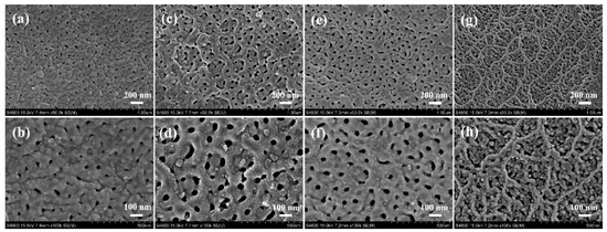 The surface SEM micrographs of anodization coatings prepared at different negative current densities for 30 min are presented in Figure 4. As can be seen, when there was no negative current during the HPA process, the surface of the anodization coating was smooth, and showed flowing morphology. In addition, the coating was compact with small-sized nanopores that were irregular in shape. When 1 A/dm2 of negative current density was applied, the nanopores got obviously much larger than those in Figure 4a,b. Continuously increasing the negative current density to 2 A/dm2, the nanopores turned a little bit larger. Besides, the surface of the coating became much flatter with less sediment, and the nanopores changed to have better distribution uniformity. It indicated that the application of negative current expanded the nanopores and obtained a well-ordered configuration. However, a large number of granular and interlacing stripe convexities appeared on the surface of anodization coatings when the negative current density reached 3 A/dm2. It caused the coating surface to be extremely uneven (Figure 4g,h). Beyond that, the nanopores arrangement turned disordered, and the nanopore diameter decreased markedly.