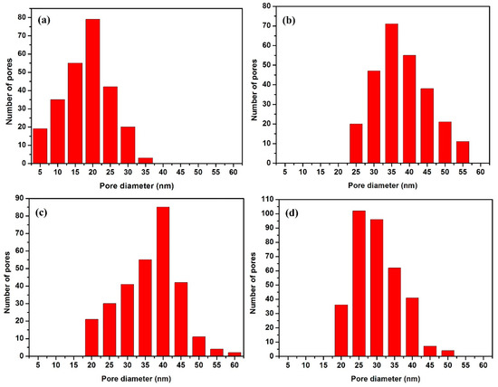 In order to further understand the nanopore diameters and their distribution, the FE-SEM images in Figure 4a,c,e,g were analyzed with the Image-Pro Plus software to identify their own characteristics. As shown in Figure 5, without negative current, the range of 20 ± 5 µm occupied the main distribution of all the nanopores. With the increase of negative current densities to 1 A/dm2 and 2 A/dm2, the diameters of nanopores were mainly distributed in 30 µm and 40 µm, respectively. It implied that the greater the negative current density, the larger the nanopore diameter. However, as the negative current density increased to 3A/dm2, the nanopore diameter became much smaller instead (Figure 5d).