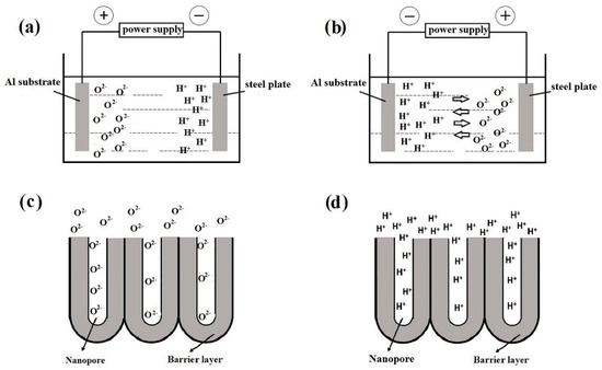 Figure 6 exhibits the schematic diagrams of two different current modes (PA and HPA). Compared with traditional DCA, the intermittent working principle was utilized in the PA process (Figure 6a). In a cycle, there was enough pulse-off time (toff) to dissipate the Joule heat generated (Formula (1)) in the anodization process (t+). Figure 6b shows the anodization current mode of HPA with a negative current. The negative current was applied to suppress the Joule heat generation by eliminating the anodic current during toff [30,31]. On the one hand, the dissolution reaction (Formula (2)) was weakened due to the timely dissipation of Joule heat; this was beneficial to decrease the dissolution rate of the coatings and lead to an increasing growth rate of anodizing coatings [22,24]. On the other hand, due to the conversion of positive and negative poles of power supply, O2− and H+ migrated to the cathode and anode, respectively. It resulted in the enhancement of the dissolution effect. There was a balance between the two sides to get a well-ordered nanopore configuration.