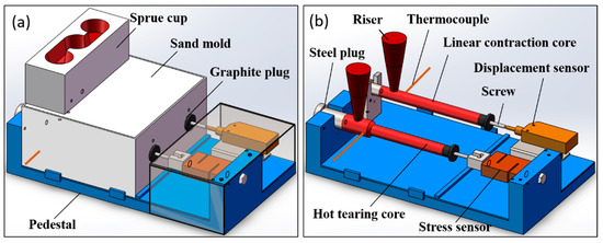 The schematic diagram of the test device is as shown in Figure 1. The pedestal material is Fe-0.45 wt.% C plain carbon steel, and its thickness is 10 mm for ensuring the rigidity of the device. The hot tearing and linear contraction measuring devices are placed on one pedestal. The sprue cup is designed to be one mold with two cavities. The sand mold material is made of silica sand and fly ash (the volume ratio of silica sand and fly ash is 20:1), and the binder is waterglass. Firstly, the conical filling pores (taper degree 1:15) that is used for exhausting are made on the formed sand mold. Secondly, the sand mold needs to be dried for 5 h in 200 °C with the purpose of ensuring the crystal water in the binder evaporates completely. Finally, an alcohol-based coating is coated on the inner surface of the mold cavity after drying, so that it can effectively avoid sand sticking and ensure the surface quality of the sample. Table 2 shows materials of sand and components of the coating. The thermocouple is type B with an upper limit of temperature of 1800 °C. The position of the thermocouples is the orange line as shown in Figure 1 and it is located 20 mm from the riser center and inserted radially into the core by 15 mm.