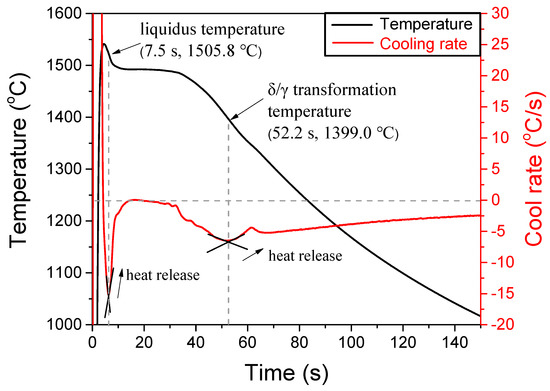 The pouring temperature of the molten steel is 1550 °C. Shown as Figure 4, from the point of view of thermal analysis, when the liquid phase transited to the solid phase, the latent heat of solidification released, and cooling rate slowed down. This corresponded to the first valley point of cooling rate curve at the solidification platform. The liquidus temperature of the steel could be judged as 1508.8 °C. The latent heat release occurred for the second time at 1399.0 °C, which was the phase transition point [5,21,27].