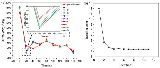 Figure 6a is the relationship between iHTCs changing with solidification, which was obtained by an iterated solving of the inverse model. As can be seen in Figure 6b, the iteration error is about 4.5 after 11 times of iteration, and it no longer decreases with an increase in the number of solutions. When the molten steel contacted with the sand mold, iHTCs were approximately 1825 W/(m2·K), it decreased rapidly to 20 W/(m2·K) at 20 s, it increased to about 400 W/(m2·K) at 40 s, after fluctuating slightly, and then it decreased to 20 W/(m2·K) at 140 s. It could have led to the change of iHTCs from 20 s to 40 s because of the existence of gas holes in the sand mold. The iHTCs being obtained in this way is closest to the actual value. Figure 7 shows that the numerical simulation cooling curve could be well matched with the measured cooling curve after correcting the iHTCs.