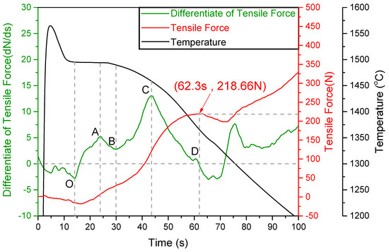 The variation rate of tensile stress at point C is zero in Figure 8, which represented tensile stress maximal value. The release of tensile stress occurred at 62.3 s in the solidification process after pouring. The measuring device limited the position of the sand mold and the stress sensor. When the molten steel was poured into the sand mold, the filling integrity of the molten steel could be judged from the sample, so the stress sensor was not subjected to reverse loading after 62.3 s, which proved the generating of hot cracks.