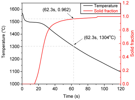 There is 10 mm between the point of the thermocouples and the hot crack along the axial direction, the temperature curve and solid fraction of the hot crack were produced by numerical simulation after correcting the iHTCs, as shown in Figure 11. The critical temperature, solid fraction and stress were 1304 °C, 0.962 and 0.72 MPa at 62.3 s after pouring, respectively. The calculation formula of critical stress is as follows:
