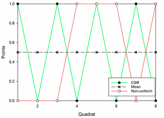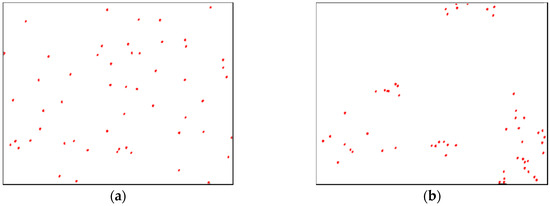 However, recent years’ interest in metal matrix nanocomposites (MMNCs) has resulted in an intensified effort in implementing mathematical models for the assessment of spatial particle distributions. In these materials, nano-sized ceramic particles are embedded into a metal matrix and the uniformity of their distribution is critical to their performance in terms of mechanical properties. Zhou et al. [16] and Kam et al. [17] have given thorough reviews of such metrics, and compared their effectiveness in various tests. In these metrics, particles are treated as dimensionless points, and the resulting patterns are referred to as spatial point patterns. To provide a reference, patterns of complete spatial randomness (CSR) are created, and a specific pattern of interest is tested and compared to the CSR pattern to assess their uniformity (or more precisely their deviation from complete spatial randomness). The CSR patterns are thus regarded as having optimal uniformity. Examples of a CSR pattern and a non-uniform pattern are found in Figure 1.
