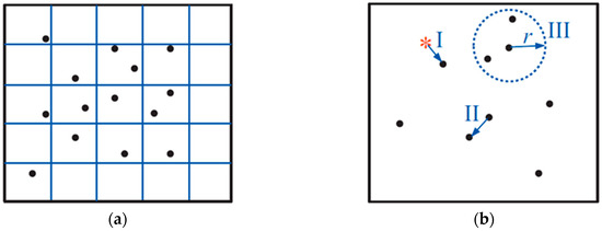 There are two main ways of quantifying the uniformity of spatial point patterns, namely with quadrat-based metrics and distance-based metrics. Distance-based metrics are based on the distances between each point. Other methods exist, but will not be considered here (for more information, see [16,17,18]). In the quadrat-based metrics, the image is separated into a grid of a certain number of quadrats (q), as illustrated in Figure 2a. Each point is then allocated to a grid, and the manner in which the points are distributed over the grids is used as the basis for the calculation of the different metrics. Quadrat-based methods are simple and convenient, but one of their weaknesses is that they do not provide spatial information about the points inside each quadrat. Distance-based metrics, illustrated in Figure 2b, provide more spatial information, but also have their drawbacks. These metrics are based on the distances between each point. However, it was pointed out by Cressie [18] that it is arbitrary if the nearest neighbour, second-nearest, third-nearest etc. are chosen, and this may largely influence your results. Moreover, a problem arises when a point is located closer to the frame of the image than any other point. This is known as the “edge-effect”, and several methods have been developed to account for this (e.g., [19]).
