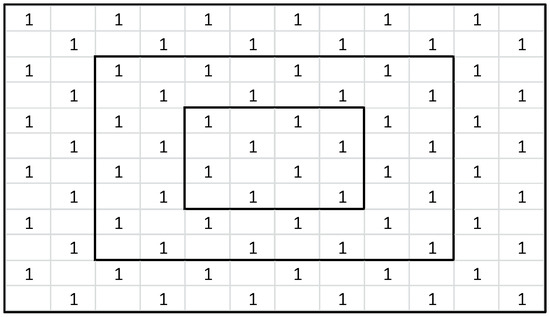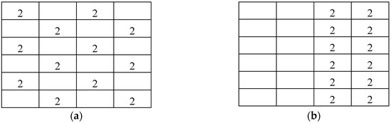 An important weakness of the GSE metric, in its original form, is that it does not provide enough spatial information. The lack of spatial information on the points inside each quadrat was mentioned in the introduction; however, there is also a lack of information about the order of the quadrats in the grid. For example, the two grids in Figure 6 represent very different spatial distributions, but the GSE metric cannot distinguish between them, and will, in both cases, result in GSE = 0.78. This is a major drawback, and likely the reason why Zhou et al. [16] and Kam et al. [17] found the metric to perform poorly at large qs. Intuitively, large qs should provide a higher resolution and therefore improved accuracy. In fact, ideally, using large enough qs should result in the resolution approaching that of distance-based metrics. However, GSE in its original form is not able to benefit from the larger amount of information available when using a higher resolution.