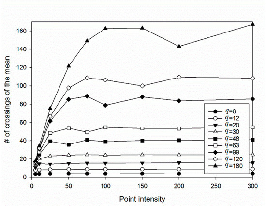 The count of crossings of the mean as a function of point intensity. The drop in the plot may be due to this being the optimal q for the specific point intensity (see text).