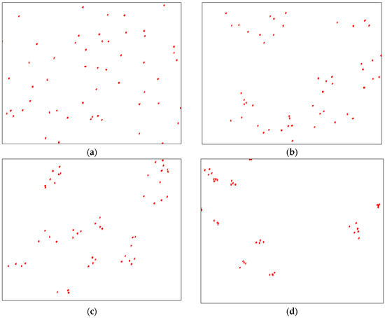 Examples of the spatial point distributions generated and tested in Figure 4, with (a) CSR, (b) σ = 8, (c) σ = 5, and (d) σ = 2.