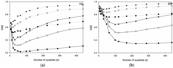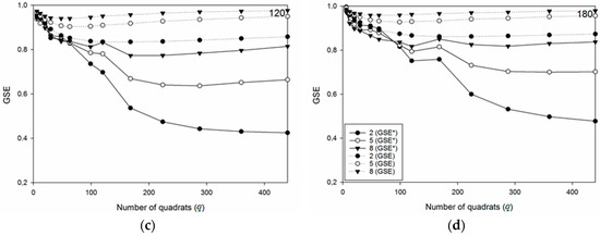 Figure 9 exemplifies four different point distributions with different degrees of clustering (non-uniformity). Figure 10a–d show the corresponding variation of the metrics, GSE and GSE*, for different point intensities, n, in each case, as a function of the number of quadrats, q. The graphs all have clusters of nc = 5, but different σ (= 2, 5, and 8). As the non-uniformity approaches CSR, it is seen that the required q for optimal detection power decreases, i.e., the minimum peak of the curves is shifted towards the smaller qs. As the patterns become more uniform for spatial distributions that approach CSR, a low q is thus necessary to detect non-uniformity. However, it is also apparent that most of the curves for the different degrees of non-uniformity separate as q increases. This means that the metric’s ability to differentiate the different spatial distributions is higher for larger qs, as long as the non-uniformity is large enough to be detected.