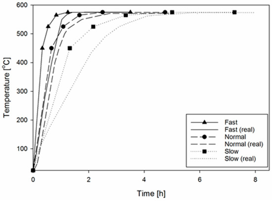 Four alloys were direct-chill (DC)-cast at Hydro (Sunndalsøra, Norway), and samples were cut out of the billets at a distance of ~3–4 cm from the centre and ~2 cm from the edge. The chemical composition of the different alloys is listed in Table 1, as determined by X-ray diffraction analysis (XRD, PANalytical Empyrean, Almelo, The Netherlands). The alloy selection was made to provide alloys (after homogenization) with different dispersoid structures, in terms of size, number density, and spatial distribution. The samples were homogenized in an air furnace (Nabertherm GmbH, Lilienthal, Germany) at a final holding temperature of 575 °C, for 2 h and 15 min. Three different heating rates were used, and all samples were water quenched upon removal. The intended homogenization cycles are found in Figure 11, along with the actual homogenization cycles logged in the furnace. The heating rate denoted “Normal” was chosen according to a typical industrial heating rate, using a five stage heating procedure set to an average of 4.6 °C/min until reaching 525 °C, and subsequently 1.0 °C/min until reaching the final temperature. The “Slow” heating rate was chosen to be the half of that of “Normal” (i.e., an average of 2.3 °C/min from 25–525 °C), while the “Fast” was set to 2 times “Normal”. As a consequence of the different heating rates, the total amount of time in the furnace was different for each heating rate.