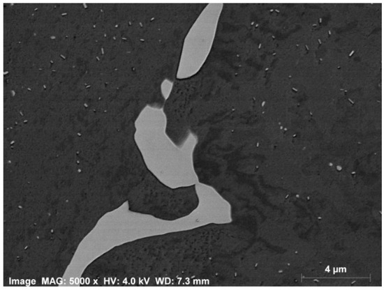 The microscope was set to the “High current” mode and an aperture of 60 µm was used to ensure a balance between a high resolution and sufficient backscatter signal. Imaging was performed in Bruker Quantax 9.4 (Bruker, Billerica, MA, USA), where the images were taken at a magnification of 5000×, and saved with a resolution of 4000 × 3000 pixels to ensure the best possible detection power. Figure 12 shows a representative BSE image from this study taken from alloy 6082. 100 such images were taken of each alloy and the heating rate and these were taken in a straight line through the samples, covering a distance of 1500 µm, and crossing approximately 18–22 grains. The total area covered was ~0.036 mm2 for each sample.