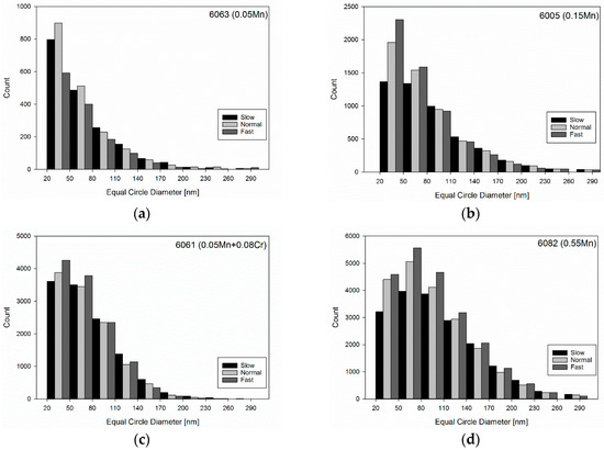 The dispersoid size distributions are presented in Figure 14. For alloys 6005, 6061, and 6082, the distribution shifted towards larger particles for slower heating rates. A “Fast” heating rate gave a larger amount of dispersoids with equivalent circle diameters (ECD) between 20–80 nm than the slower heating rates. For the larger particles, the black column, indicating the “Slow” heating rate, became dominant. This behaviour was more pronounced for alloys 6005 and 6082, which contained the highest levels of Mn.