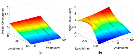 The deformation of the sample surfaces were determined according to the measured contour results using the enveloping surface method. A series of two parallel envelopes were used to envelop all the measuring points, and the minimum distance between the two envelopes was taken as the deformation result. The procedure for determining the enveloping surface is as follows: The normal vector of a set of parallel planes can be defined as N (a, b, c). The distance from the point (xi, yi, zi) to the plane is as follows [20]: