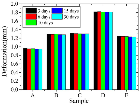 In Figure 15, as a whole, with the increase in natural aging time, the deformation difference of the parts increased gradually, but the changes of deformation became smaller. The change of deformation of samples B and C were small over different days of natural aging especially for 15 days and 30 days, which also shows that a period of 15 to 20 min of vibration stress relief has a better effect on the sample. It can be concluded that vibration stress relief accelerated the deformation of the thin-walled parts to a certain extent, especially after 15 min to 20 min of vibration stress relief, which has the greatest impact on the sample and results in a more stable shape.