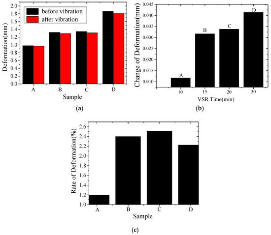 From Figure 13a,b, we can see that the deformation of specimens decreased after a period of 10–30 min of VSR. For samples A, B, C and D, the changes of deformation before and after VSR achieved 0.011 mm, 0.031 mm, 0.033 mm and 0.041 mm respectively. As shown in Figure 13c, it can be seen that a period of 15–20 min of VSR had a better effect on reducing the deformation by comparing the change in the rate of deformation of the samples before and after VSR.