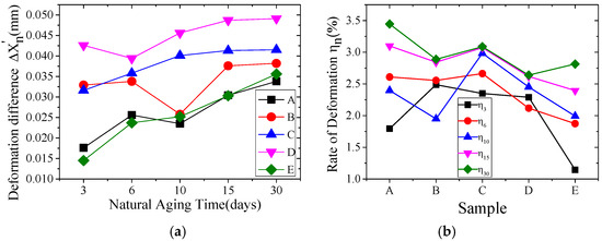 Δ X n is defined as the difference between the deformation of the samples after natural aging n days and after machining, respectively. It is expressed as: Δ X n = | X n X m | , unit: mm. ηn is defined as the relative difference between the deformation of the samples after natural aging n days and after machining, and it is expressed as η n = | ( X n X m ) | · 100 / X m , unit: %.