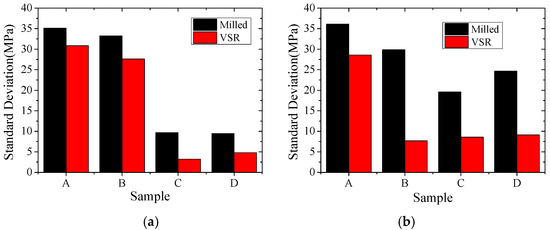 Figure 16. Standard deviation of surface stress before and after VSR. (a) X stress; (b) Y stress.