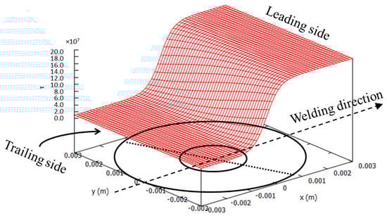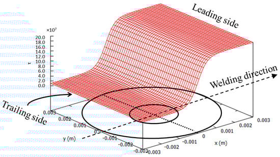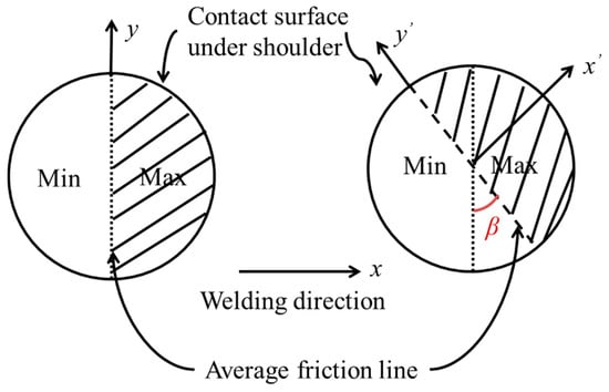 α (backwards), as the FSW tool advances in the weld direction, the contact surface that has a maximum friction value in front of the tool and minimum friction in the rear side rotates a certain angle