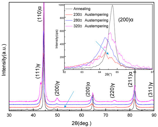 The XRD analysis of the samples that had been austempered at different temperatures after heating to 950 °C showed that the structure mainly consisted of fcc lattice (γ-Fe) and bcc lattice (α-Fe), as shown in Figure 2. It was evident that the γ-Fe phase was the residual parent phase, while the α-Fe phase was the new phase formed during the isothermal process. Compared with the annealed samples, the peaks of the α-Fe phase in the austempered samples, such as the peaks representing the (200) crystal plane of α-Fe, were more diffuse. On the basis of previous X-ray diffraction studies [25,26], this result means that the α-Fe phase formed smaller grains in the austempered samples. Compared to the other austempered samples, the diffraction peak representing the (200) plane of the α-Fe in the sample that was austempered at 230 °C was the widest and the lowest in intensity (indicated by the arrow). When the austempering temperature was increased to 280 °C, the width of the diffraction peak representing the (200) plane of α-Fe was slightly reduced but the intensity clearly increased. When the austempering temperature was increased to 320 °C, the (200) plane diffraction peak of α-Fe became more cuspidal. This showed that when the austempering time of the samples was the same, the increasing of the austempering temperature caused the α-Fe grains to grow. At lower austempering temperatures, the α-Fe grains were finer, but their total content was lower.