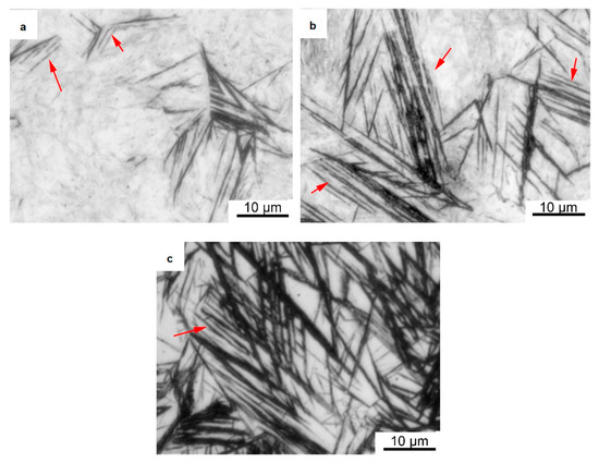 A substantial number of observations of the austempered samples were made using an optical microscope. It was found that a new phase consisting of extremely fine strips arranged in parallel was formed in the samples, as shown in Figure 3a–c. The length of each strip ranged from a few micrometers to tens of micrometers (indicated by the red arrows), and their widths were too small to measure using an optical microscope. The samples austempered at 230 °C showed the lowest number of paralleled strips. With an increase in the austempering temperature to 280 °C, these paralleled strips became significantly longer, but they remained extremely thin. When the austempering temperature reached 320 °C, the number of strips in the samples increased, and they became significantly wider. This result shows that when the austempering temperature exceeded 280 °C, the width of the strips could be increased. Based on quantitative metallography, we used the Proimaging software (Version 1.1, Carl Zeiss, Oberkochen, Germany) to analyze the amounts of this phase, and the results showed that the amounts of the bcc phase were 6%, 25%, and 36%, respectively. This is consistent with the previous XRD results.