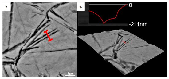 To further reveal the three-dimensional characteristics of these strips, we used a 4% nitric acid ethanol solution to etch the sample (austempered at 280 °C) for 12 s. A typical SEM micrograph of the corroded areas is shown in Figure 4. Parallel furrow-like structures were observed. The grooves were the α-Fe lattice phases, which were deeply eroded by the nitric acid solution, while the embossments were the remaining γ-Fe lattice phases [27]. Three-dimensional roughness analysis showed that the strips has a height of more than 200 nm.