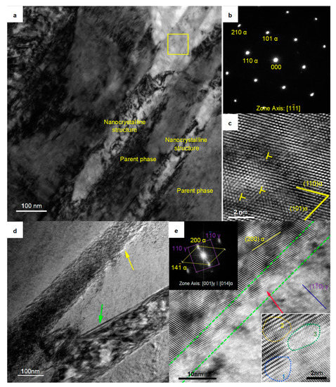 The nanoplate indicated by the yellow arrow in Figure 5d was perpendicular to the viewing surface (unlike the nanoplate indicated by the green arrow in Figure 5d; there were no bands of equal thickness, which indicated a boundary that was not perpendicular to the viewing surface). There was an exceptionally bright contrast at the boundary between the nanoplate and the parent phase. Studies on the boundary structure of nanocrystalline structures have attracted great attention [31,32,33,34], so this feature was worthy of further study. HRTEM analysis was performed on this region, and, as shown in Figure 5e, the junction region between the nanoplate and the parent phase (framed by the green dashed line) had a concave–convex structure. The width of this region was approximately 5 nm. We enlarged the concave area indicated by the red arrow and found it had features characteristic of a transitional boundary: the γ-Fe lattice and the α-Fe lattice were coherent at zone 1, the α-Fe lattices were distorted in zone 2, and those in zone 3, which were adjacent to zone 2, were distinctive. The lattices in zone 3 were disordered (they did not belong to the α-Fe crystal lattice or the γ-Fe crystal lattice, while the lattices in the γ-Fe phase clearly showed a (10) γ crystal plane, and the lattices in the α-Fe phase showed a (200) α crystal plane).