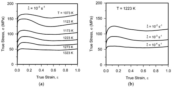 The flow stresses exhibit typical hot deformation behavior. Namely, the flow stress increases as the deformation temperature decreases (Figure 1a) and/or the strain rate increases (Figure 1b). This relatively strong temperature/strain rate dependence of the flow stress is commonly discussed in terms of a power law of the temperature-compensated strain rate (Zener-Hollomon parameter), , where Q is the activation energy, R is the universal gas constant, and T is the temperature [1]. Figure 2a shows the relationship between the flow stress at steady-state deformation (σss) and temperature (T). Four arbitrarily selected stress levels indicated by dashed lines in Figure 2a are further used in Figure 2b, which represents the relationship between the corresponding strain rates and temperatures for the chosen stress levels. It is clear from Figure 2b that all strain rates at constant steady-state stresses exhibit almost the same temperature dependencies. Therefore, the activation energy of 385 kJ/mole is obtained for the studied range of the hot working conditions. This activation energy is about 1.5 times higher than the activation energy of lattice diffusion in γ-iron of 270 kJ/mole [20]. A similar relationship between the activation energies for lattice diffusion and hot deformation has been reported in numerous other studies on the hot working of metallic materials exhibiting discontinuous DRX behavior [10,16,21,22,23].