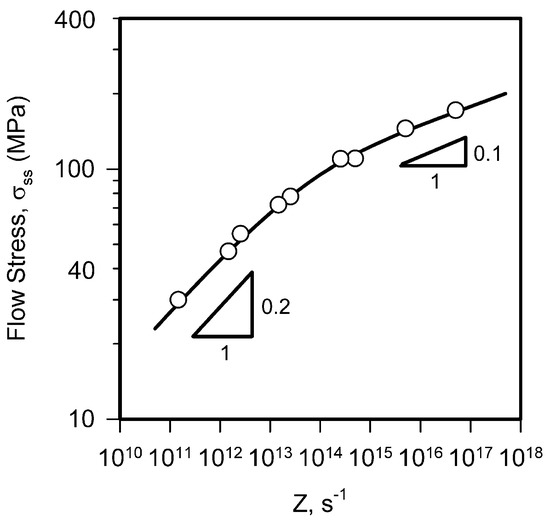 Figure 3 shows the relationship between the steady-state flow stress and the deformation condition expressed by the temperature-compensated strain rate, Z. The flow stress can be expressed by a power law function of Z with an exponent of 0.2 in the range of low Z in Figure 3. This agrees well with other studies on hot working and creep at elevated temperatures, when the power law relationship generally holds between the flow stress and strain rate with a stress exponent of 5 [18,20]. In contrast, the temperature and/or strain rate effect on the flow stress diminishes with an increase in Z. An exponent of about m = 0.1 is obtained for σss—Zm relationship in the range of high Z in Figure 2. This domain of deformation conditions corresponds to a so-called power law breakdown, when the stress exponent in the stress-strain rate relationship progressively increases with a decrease in the deformation temperature and/or an increase in the strain rate [24].