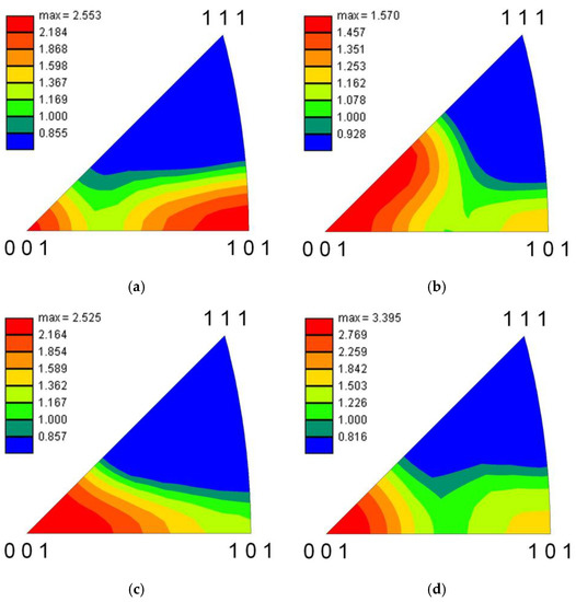 Inverse pole figures for a high-Mn steel subjected to hot compression at T = 1073 K and strain rate of 10−2 s−1 (a); at 1073 K and 10−3 s−1 (b); at 1223 K and 10−2 s−1 (c); and at 1323 K and 10−3 s−1 (d).