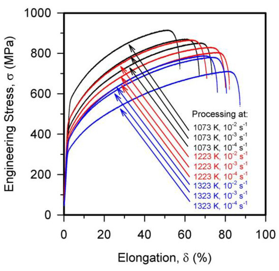 A series of the engineering stress-elongation curves after tensile tests of the steel samples processed by hot compression is shown in Figure 7, whereas strength and elongation are listed in Table 1. All samples demonstrate large elongations. It should be noted that uniform and total elongations are almost the same. This is typical tensile behavior of TWIP steels [12,13,14]. A decrease in the temperature and/or increase in the strain rate of the previous hot deformation results in significant strengthening. The yield strength and ultimate tensile strength are 305–540 MPa and 710–920 MPa, respectively, depending on the hot working conditions. An increase in the strength is accompanied by a decrease in plasticity, although all samples with fully DRX microstructures exhibit total elongation well above 60%. Even the sample with the partially recrystallized necklace-type microstructure that evolved during compression at the highest temperature-compensated strain rate of about 1017 s−1 demonstrates uniform elongation above 50% along with a high yield strength of 540 MPa.