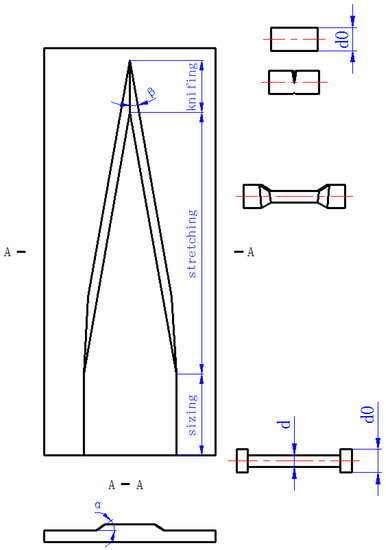 A CWR process is illustrated in Figure 1, which consists of three zones: a knifing zone, stretching zone, and sizing zone. The basic parameters of CWR are forming angle α, stretching angle β, area reduction ratio ψ and the rolling temperature. Usually, the area reduction ratio ψ is fixed by the product and the rolling temperature is decided by the material properties. Therefore, the proper forming angle and stretching angle are needed be chosen to guarantee the forming quality of the product.
