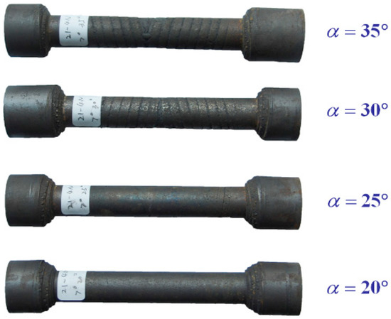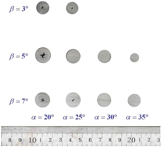 The influence of the forming angle on central quality is shown in Figure 7. With the increase of the forming angle, the central damage got smaller, and when , no central damage was found. At , when , the workpiece has a cavity of about 2.9 mm2 in area, when , the cavity decreases to about 1.4 mm2 in area. No cavity was found when and . Along with the increase of forming angle, the area A was kept the same, but the shape of area B became steeper. This caused a larger axial force, which was good for the metal’s axial deformation and the lateral deformation became smaller. Consequently, the shear stress at the cross section got smaller, and central cavities were less likely to be nucleated. Meanwhile, the rolling radius of the rolled part increased with the increase of the forming angle [34], which caused the rolling cycles to decrease. The wedge type dies got shorter with a larger forming angle. When , the total length was 1215 mm, which is a little smaller than that of . As such, the cyclic number of shear deformation decreased [23]. Smaller shear stress and the less frequent cycles of shear stress led to a better central quality at a larger forming angle.