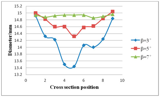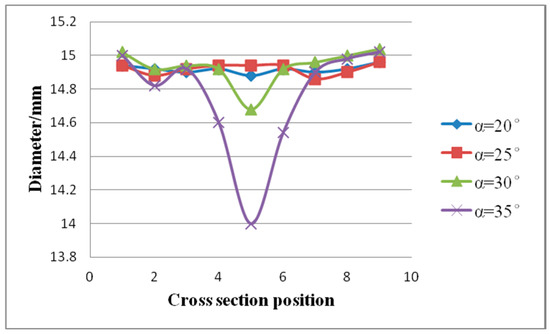 When the forming angle was kept the same, diameters variations are more serious at a smaller stretching angle, as shown in Figure 5. With the forming angle of 25°, the maximum difference of the measured diameters is 1.48 mm at stretch angle of 3°, but at the stretch angle of 7°, the maximum difference decreased to 0.1 mm. This diameter difference was due to necking. The necking can be predicted by the equation: , where is the total axial force, d is the diameter after rolling, and is the yield stress of the material rolled. However, because of the complexity of the deformation zone geometry and the deformation mechanism, the theoretical analysis of the CWR process is difficult [28]. In this study, for simplicity, the acting force F was divided into two parts, one is affected by stretching angle and the other is affected by the forming angle . From the view of stretching angle, the acting force on the billet can be decomposed to axial force and tangential force , where . When the stretching angle is smaller, the axial force is larger. In the research of Peng et al. [29], the total axial force was affected by the stretching angle , and the value decreased linearly with the increase of stretching angle. As such, a greater stretching angle leads to a smaller axial force. The axial force can promote the axial flow of the metal, so the axial flow is more sufficient with larger axial force. But a heavier axial force may cause necking and the diameters after rolling were decreased. Therefore, a larger stretching angle is better for diameter uniformity.