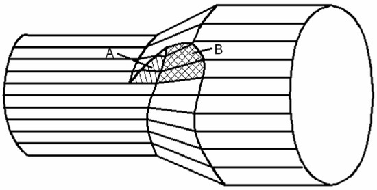 As shown in Figure 8, contact areas during CWR process can be simplified into two portions: A and B. Area A contacted with the top surface of the roller. Area B contacted with the side surface of the wedge shape dies. The metal under surface A was forced to flow in radial direction, but meanwhile, the metal was also prone to deform in a lateral direction. When the stretching angle increased, the area A increased, causing a more serious lateral deformation. Also, as the shear stress at the central area of the cross section increased, the central area was more prone to be damaged to form cavities.