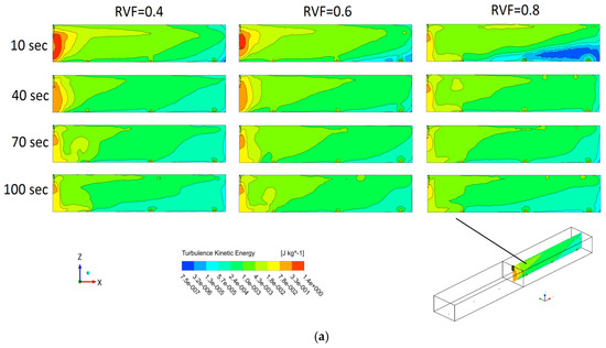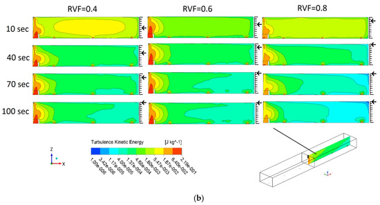 The process of mixing of two different miscible grades in tundish occurs by displacing and diluting the old melt region. The mixing phenomenon is influenced by differences in viscosity and density. The mixing of different grades in tundish is more predominant by the macroscopic phenomenon, however, it is also impacted by the microscopic phenomenon. The mixing phenomenon of different fluids depends upon turbulent kinetic energy. The kinetic energy of turbulent fluid exchanges between the mean and fluctuating layers of fluid. The contours of turbulent kinetic energy on a vertical plane, which is passing through the mid of tundish, has been shown in Figure 5. The predicted contours have been plotted with respect to the time of inlet of new grade fluid. In Figure 5a, it has been observed that the bottom zone of tundish was more influenced by turbulent kinetic energy. The turbulent kinetic energy at the bottom zone was produced by the shear and friction of incoming grade steel. It has also been noted that at a low fraction of residual volume, kinetic energy formation was dominant in the inlet zone of the tundish because of inlet velocity, fluid shear, and friction. This phenomenon considerably enhances the inclusion formation in tundish [9]. In contrast to this, the magnitude of turbulent kinetic energy has been noted higher at the middle outlet and far outlet at tundish with APB because of fluid shear and viscous dissipation, as shown in Figure 5b. The bath height of the tundish is depicted by arrow in Figure 5b. The change in flow behavior of incoming new grade steel has also been observed because of the placement of APB. It was seen that the value of turbulent kinetic energy has limited influence at the zone of APB, as compared with a bare tundish. The phenomenon of limited intermixing at APB zone has been possibly caused due to turbulence energy cascade and dissipation by the viscous forces at the inlet zone. It was also observed that a less amount of residual volume tundish has more mixing of the new grade in the tundish. The use of APB in tundish has modified geometry and subsequently the fluid flow pattern. It was found that fluid displacement and dispersion pattern has been modified after the use of APB.