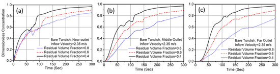 F-curves by varying the residual volume of reduced scale bare tundish: (a) Near outlet, (b) middle outlet, and (c) far outlet.
