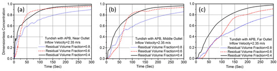 F-curves by varying the residual volume of reduced scale tundish with APB: (a) Near outlet, (b) middle outlet, and (c) far outlet.